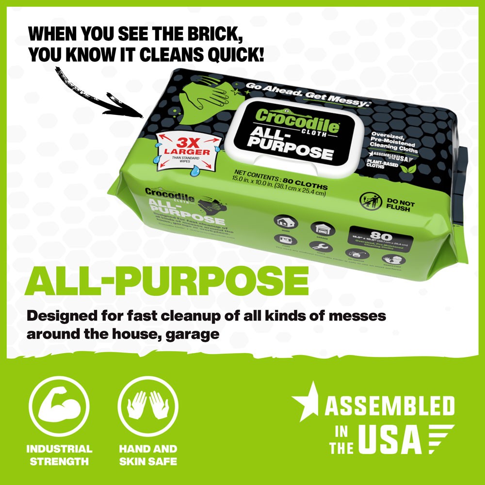 - NO MORE WIMPY WIPES: These oversized wipes aren’t just tough on messes, they’re incredibly strong & are no match for the competition. Crocodile Cloth® is designed to be over 4x more effective than the standard cleaning wipe & is proudly Made in the USA.