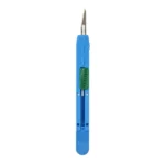 - Blade retracts with one simple motion and can be permanently locked inside the handle for safe disposal