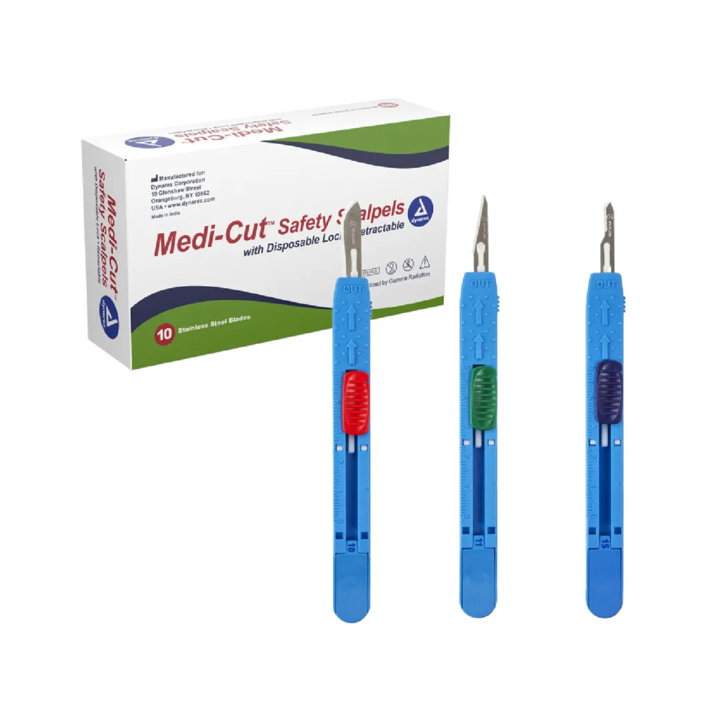 The Dynarex Medicut Safety Scalpels feature a stainless steel blade that retracts with one simple motion, permanently locking the blade inside the handle for safe disposal. These Safety Scalpels are ideal for hospitals and clinics.