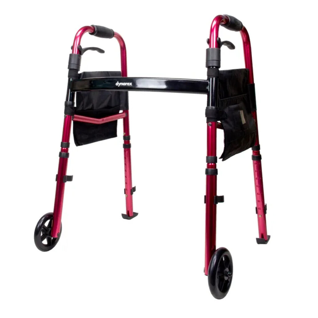 The Dynarex Travel Walker is a height-adjustable walker designed with a convenient tool-free folding mechanism. The 5” front wheels and ski glide tips are designed to easily glide over surfaces, both indoors and out, to reduce scratching. This compact mobility option is convenient and suited for individuals up to 300 lb. Ideal for a wide range of home healthcare settings.